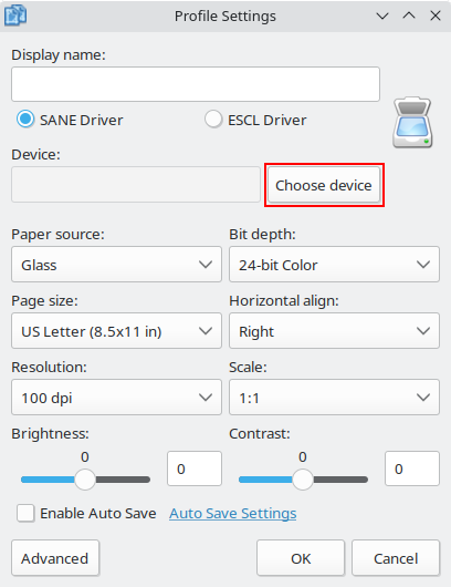 Click the "Choose device" button to select your scanner. It might take a while (10+ seconds) for your scanner to show up.
