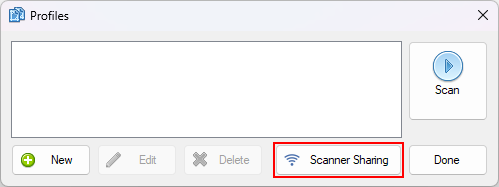 On the computer the scanner is connected to, you can open the "Scanner Sharing" window from the "Profiles" window (or the "Scan" dropdown).