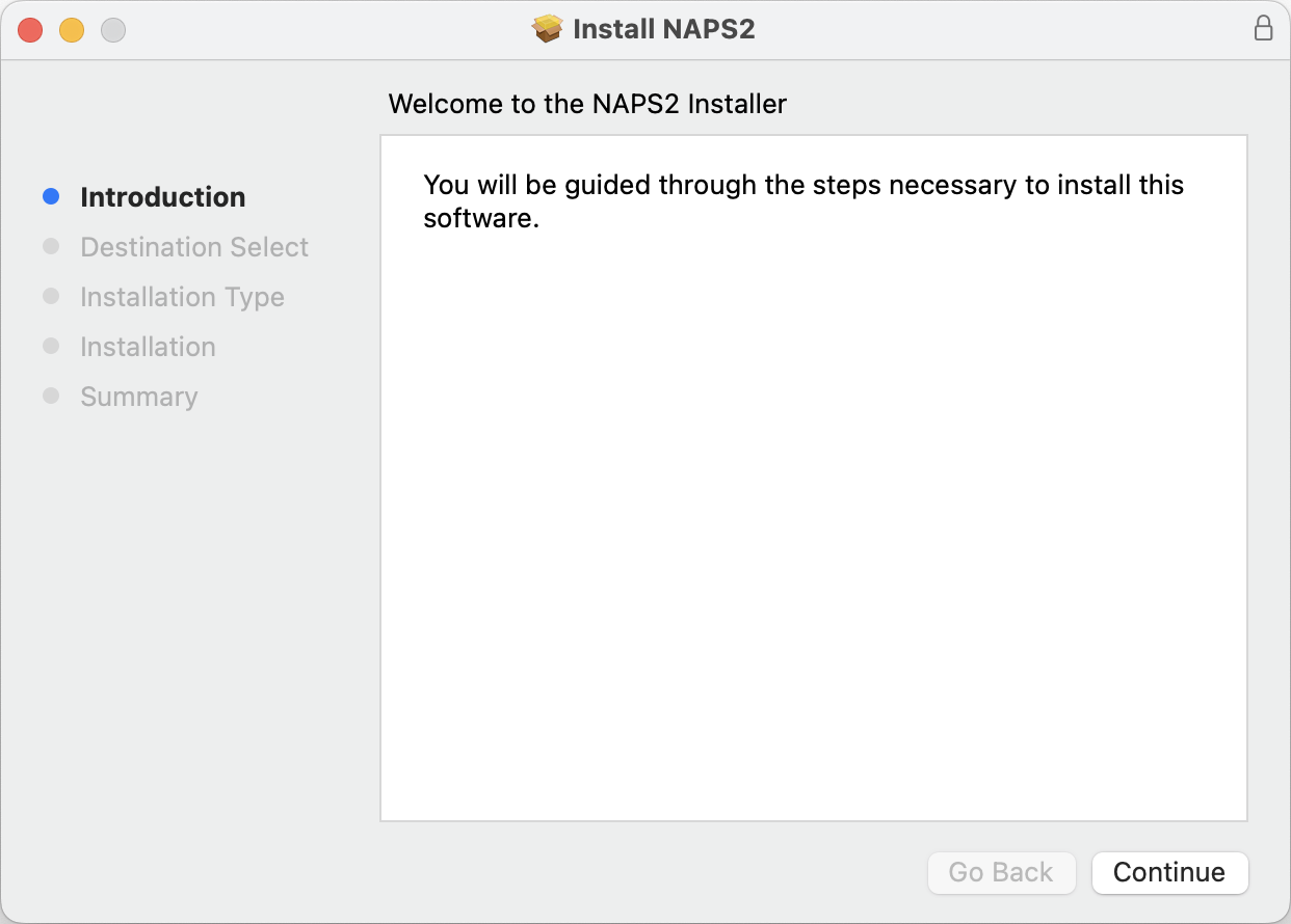 Download the NAPS2 installer from the download page. The universal installer works on all Macs.
